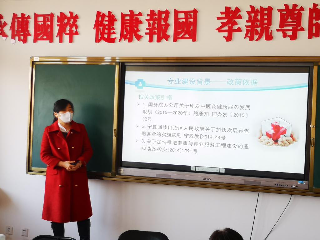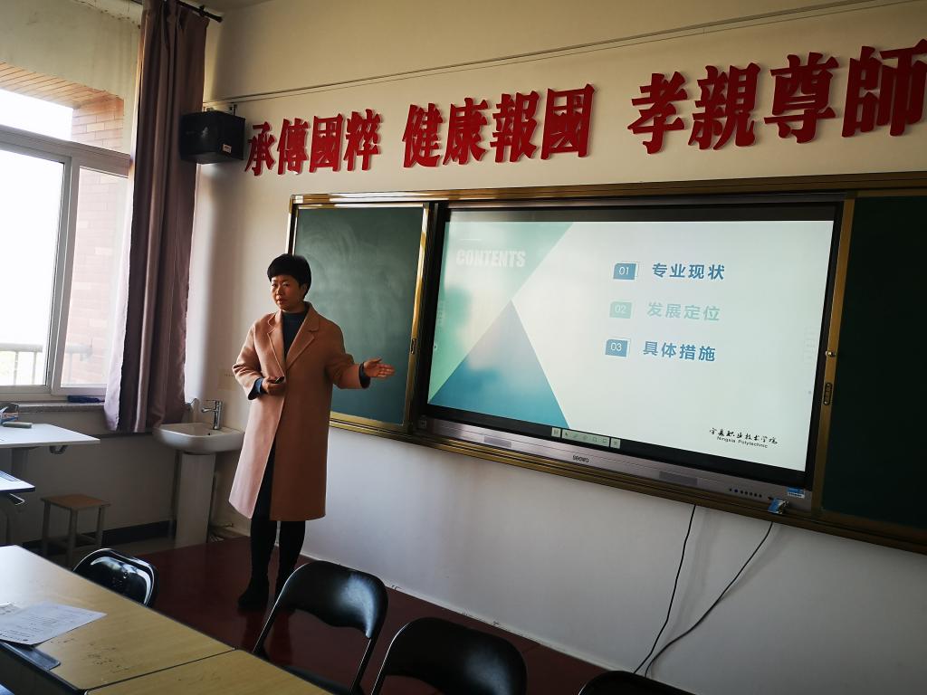 老年服务与管理教研室主任袁枫老师首先从专业建设背景、基础、思路、内容、经费预算以及效果评价六个方面对系部发展现状进行了介绍,并从专业今后的发展方向、团队队伍建设、实训室建设方面进行了具体筹划和部署。